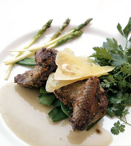 Gepaneerd en gebakken jonge duif op een bedje van tuinbonen en groene kruiden met een sausje van Tierenteynmosterd
